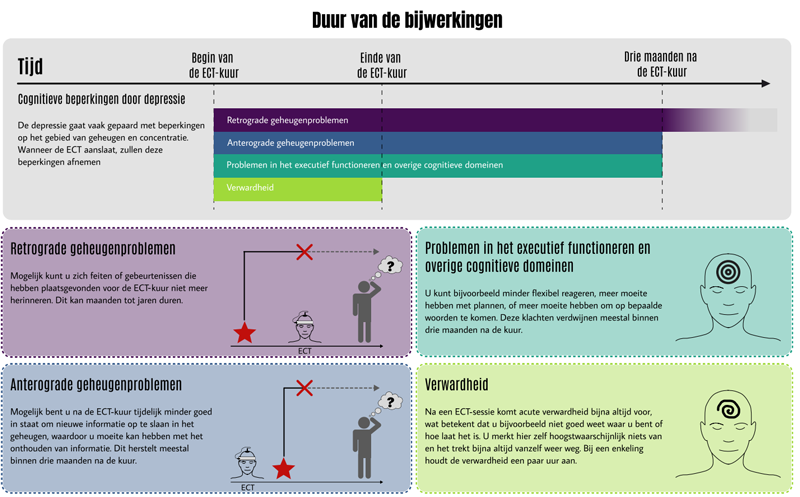 ECT kan gepaard gaan met verschillende cognitieve bijwerkingen, die doorgaans in twee categorieën worden verdeeld: acute en subacute/langdurige effecten. Acute bijwerkingen treden direct na een ECT-sessie op en zijn meestal van korte duur. Subacute en langdurige bijwerkingen kunnen zichtbaar worden tijdens de gehele ECT-kuur en blijven soms ook na het beëindigen van de ECT-kuur bestaan. Figuur 1 (zie p. 154) toont de mogelijke cognitieve bijwerkingen van ECT en wordt in de praktijk gebruikt om voorlichting te geven aan patiënten en hun naasten.